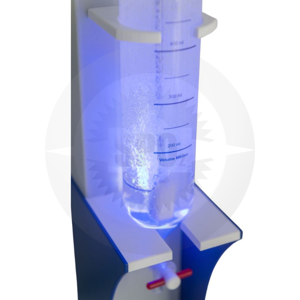 A taxa de transferência gás/líquido é influenciada por diversos fatores, tais como altura da coluna e o tamanho das bolhas. O princípio de funcionamento da coluna é promover a difusão do Ozônio na água através do contato de microbolhas do gás com o líquido com maior tempo de contato. A coluna conta com um catalisador de ozônio, onde todo excesso de gás é convertido novamente a oxigênio, oferecendo segurança ao usuário. A coluna de água conta também com um led para iluminação com alimentação a bateria.